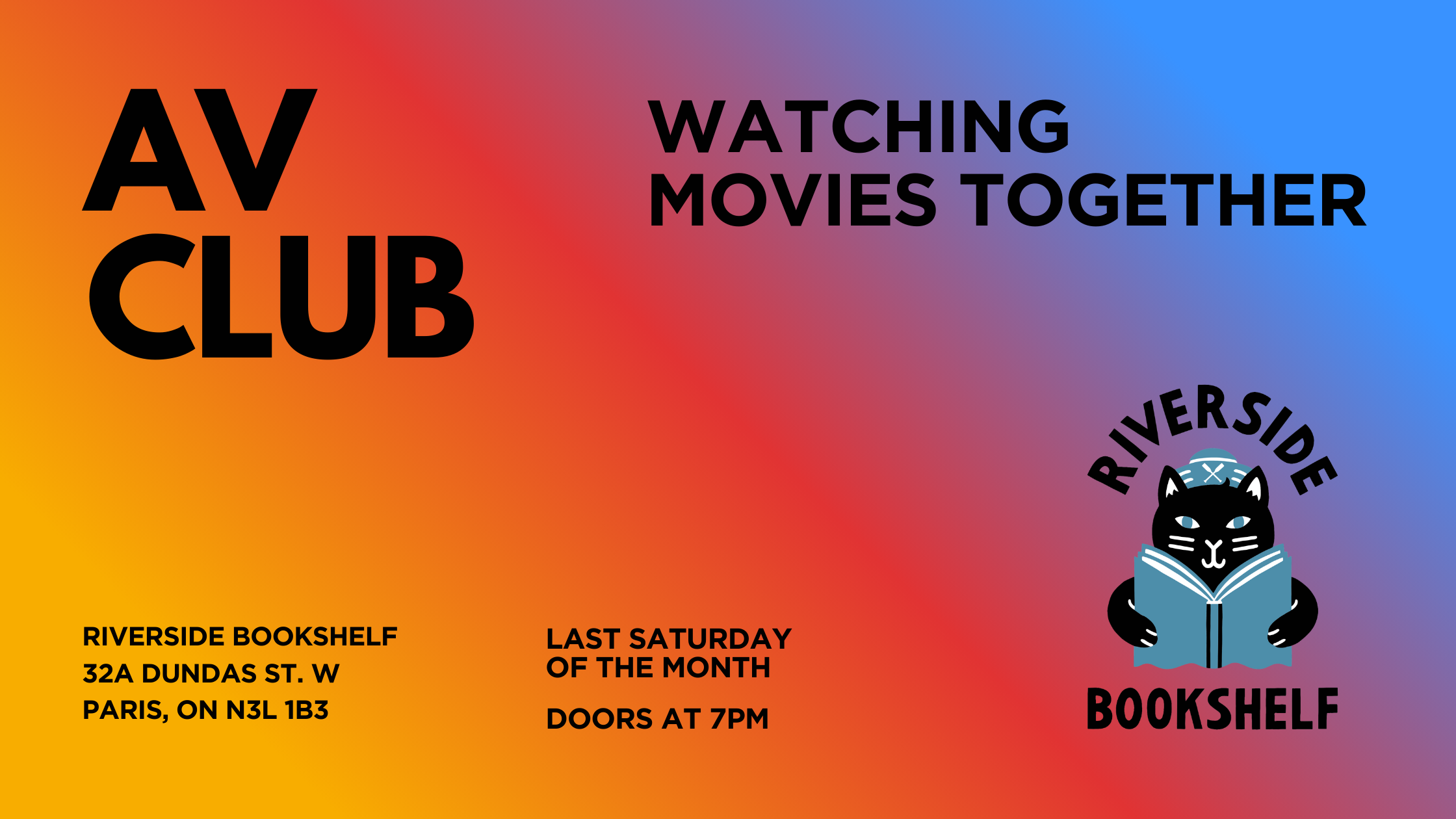 Join the AV Club at Riverside Bookshelf, a monthly in-person gathering for people to watch interesting movies in a room with other people who want to watch interesting movies. Space is limited — book your ticket in advance to secure a seat.